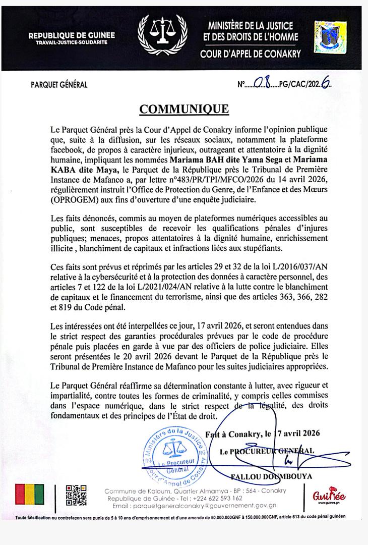 Dans un communiqué rendu public ce vendredi 17 avril 2026, le Parquet Général près la Cour d’Appel de Conakry a annoncé l’interpellation de l’artiste Yama Sega et de l’influenceuse Maya « La Solution » par les services de l’Office de Protection du Genre, de l’Enfance et des Mœurs (OPROGEM). Cette arrestation fait suite à la diffusion sur les réseaux sociaux, notamment Facebook, de propos à caractère injurieux, outrageants et attentatoires à la dignité humaine.